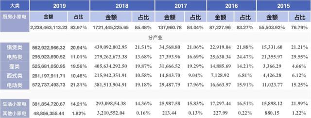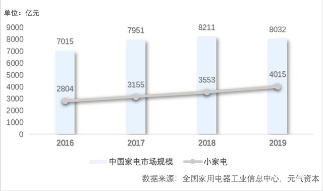 2019年全国家电行业整体规模8032亿元,同比首次出现负增长;小家电却在其中贡献了超过4000亿元,扛起半壁江山,连续六年保持了10%以上的增速。这确定了市场空间的天花板,同时从行业的角度肯定了消费模式在制造业领域的适用性。