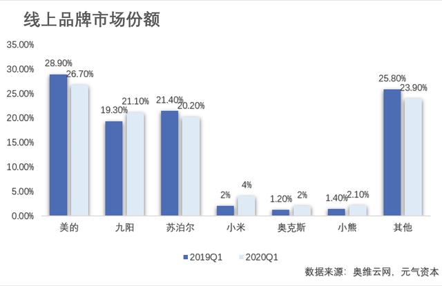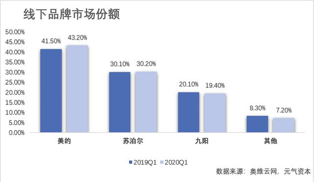 这是一个很有趣的趋势,因为即便是2020年,线下市场中美的、苏泊尔、九阳组成的“美苏九天团”仍然包揽了逾90%的份额,格局稳定,尾部品牌几乎毫无机会,这是渠道层面的垄断。