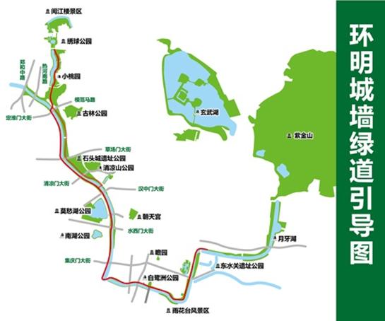 明城墙绿道包含城墙内外两条路线,全长约25公里的外侧绿道于2014年贯通,全长约18公里的内侧绿道于2018年底贯通。绿道大部分段落依墙而建,城墙缺失的部分主要结合城市道路建设,便于市民及游客感受明城墙的全貌。内外绿道互为呼应,在城市道路以及城墙拐弯、城门处互相串联,构成了完整的明城墙慢行绿道系统。