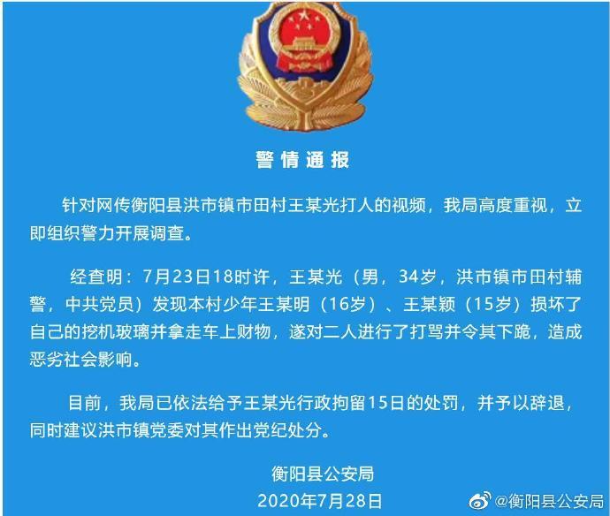 针对网传湖南衡阳县洪市镇市田村王某光打人的视频,我局高度重视,立即组织警力开展调查。