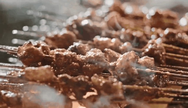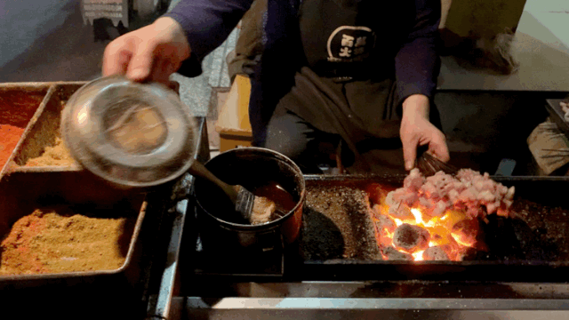 叫上一把,坐在塑料凳子上看摊主现烤,一手加料,一手捻着肉串旋转着上下翻飞,滴上羊油,只见火焰「轰」地一下窜上来包裹了肉串,手的动作却一点没停,此等神功,真像一门艺术。