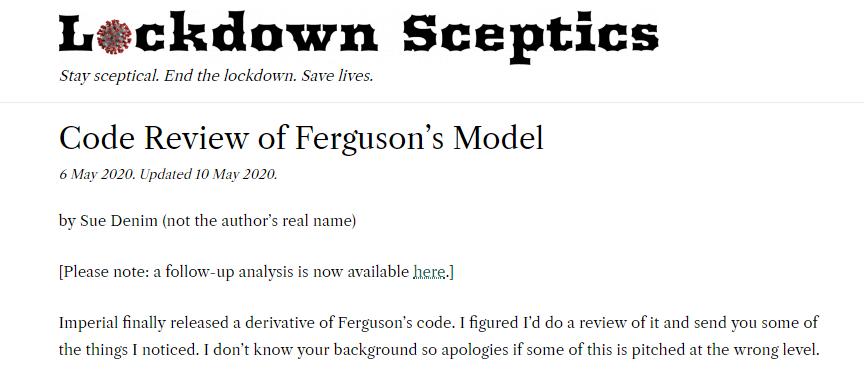 今年5月初,一名自称是谷歌前员工的人在“质疑封城”网站上发表了一篇文章,内容是对弗格森教授疫情研究所用的代码进行评审。
