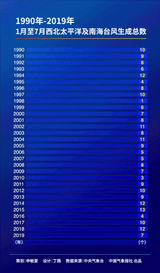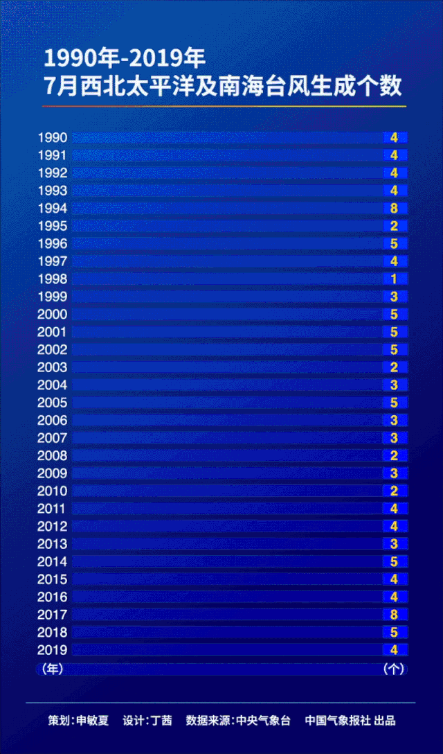 根据1949年至2019年台风数据统计,7月份生成的台风个数在全年占比15.2%。