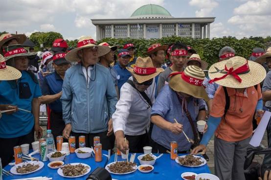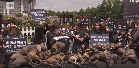 2019年7月12日,爱狗人士在韩国国会门口举着幼犬尸体示威,希望国会能够通过禁止狗肉消费的法案;而在示威人群的另一面,狗肉业者却认为此项法案将会影响到自己的合理生存,同样在摆摊抗议,抗议国会限制狗肉消费。