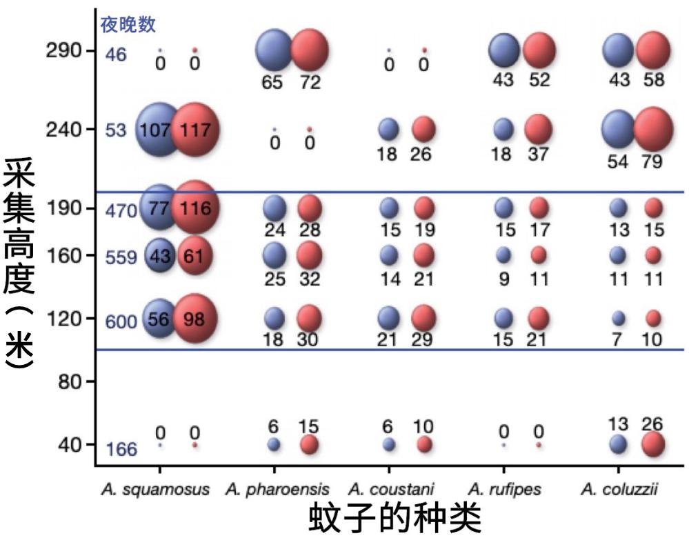 蓝球表示平均每 3000 m⊃2; 粘板上的蚊子数量