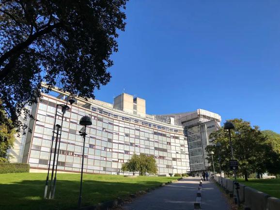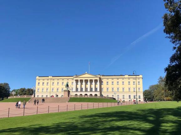 第二天早上吃完早饭后,我就出门搭轻轨准备去霍尔门考伦跳雪台。走去轻轨站的路上又路过了奥斯陆皇宫,不用加任何滤镜,在蓝天和草坪衬托下皇宫呈现一种淡淡奶油色,特别梦幻。
