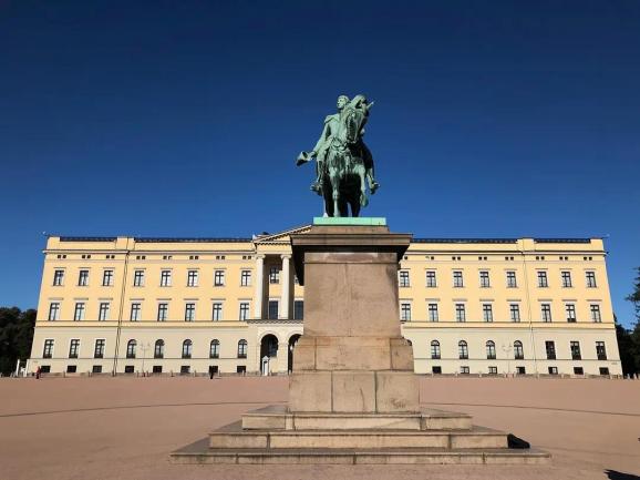 挪威皇宫是座毫无特色的淡黄建筑,四周都是公园。皇宫前矗立的雕像就是骑在马上的卡尔·约翰斯。国家剧院旁边的花圃里有很多话剧里的人物雕像,挪威戏剧家易卜生的雕像立在剧院的正门前。
