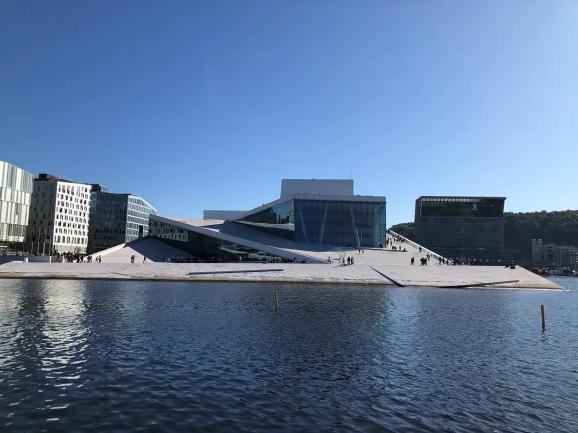 顺着海岸线一路走来,就能看到奥斯陆歌剧院,这是一座地标式的建筑,从剧院外面看,最显著的特征是白色的斜坡状石制屋顶从奥斯陆峡湾(Oslofjord)中拔地而起,游客可以在屋顶上面漫步,饱览市容美景。从侧面看就是一个巨大的斜面。