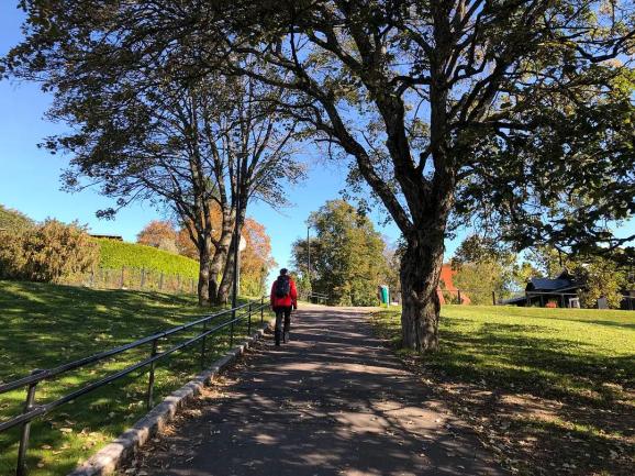 轻轨站位于山脚,要去滑雪跳台得沿着步行道往上爬一段,空气、景色都很棒,我当时只希望这条路越长越好。