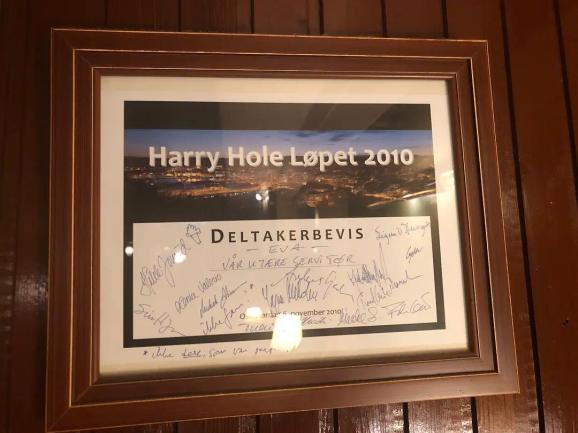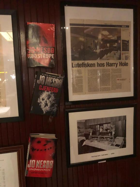 这里墙壁上挂有一些剪报,我认出了哈利霍勒的名字Harry Hole。墙上还挂着几本奈斯博(Jo Nesbo)的书!
