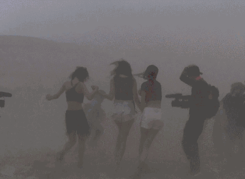 沙尘暴席卷而来,摄影师大喊“快躲起来,注意安全啊!”。扛着设备落荒而逃,现场一下子只剩下背影。