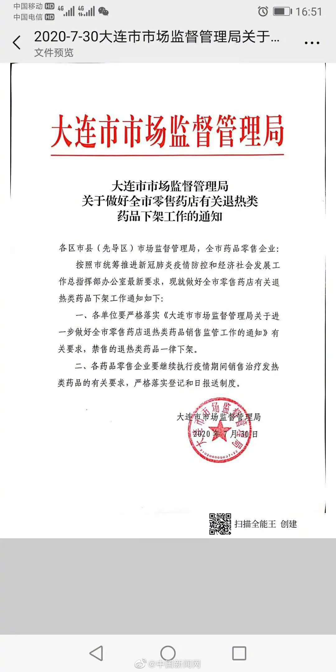 @中国新闻网 7月30日消息,大连市市场监督管理局当日发布《关于做好全市零售药店有关退热类药品下架通知》,宣布即日起,禁售的退热类药品一律下架。各药品零售企业要执行疫情期间销售治疗发热类药品的有关要求,严格落实登记和日报送制度。