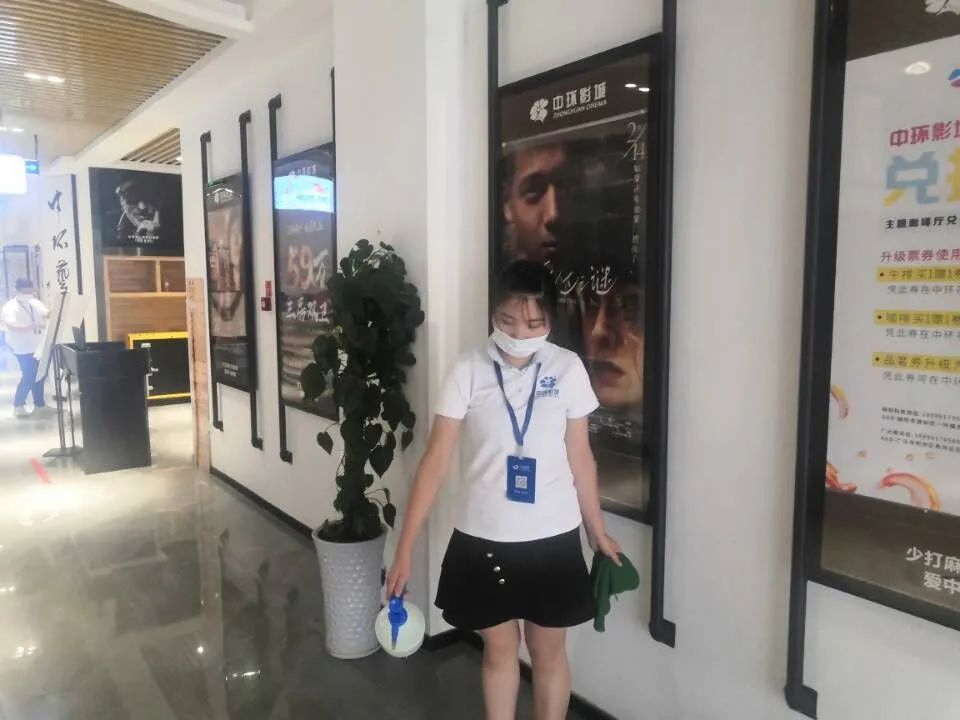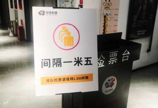 进入影城走廊,数名工作人员正在进行消杀,在检票台处清晰提示,排队检票需要间隔1.5米。