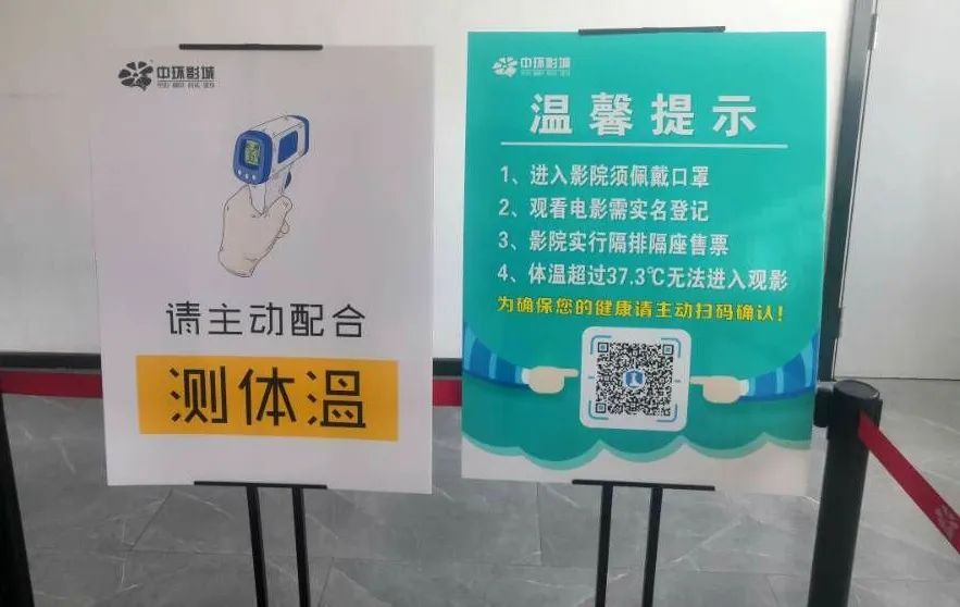 昨日中午,记者来到中环影城南河店进行走访。在进入影城的大门处,树立有两张观影温馨提示宣传图,上面内容显示:进入影院须佩戴口罩,观看电影需实名登记,影院实行隔排隔座售票,体温超过37.3℃无法进入观 影。在一旁的桌子上,放着一瓶消毒液和一个登记册。