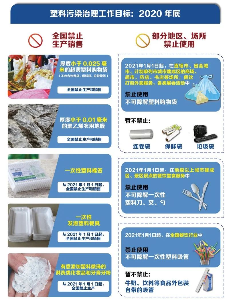 2020年7月, 国家发改委、生态环境部等九部门联合印发《关于扎实推进塑料污染治理工作的通知》,提出自明年1月1日起,在直辖市、省会城市、计划单列市城市建成区的商场、超市、药店、书店等场所,餐饮打包外卖服务以及各类展会活动中,禁止使用不可降解塑料购物袋。同时,明年起全国禁止生产和销售一次性塑料棉签、一次性发泡塑料餐具;全国餐饮行业禁止使用不可降解一次性塑料吸管。
