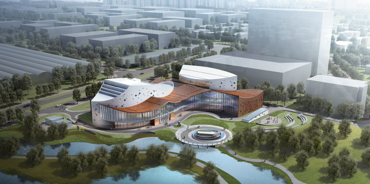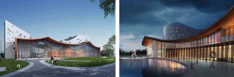 映月文化中心项目,位于佛山市南海区桂城街道夏平东路南侧、桂城映月湖东侧。项目设计构思源于映月湖畔的轻舟或游鱼的抽象表达,一方面有吉祥的文寓意,一方面和湖水月色相辉映。同时也建构出丰富的空间变化和标志性的建筑形象,满足市民对该片区的公共文化设施和公共文化服务的需要。