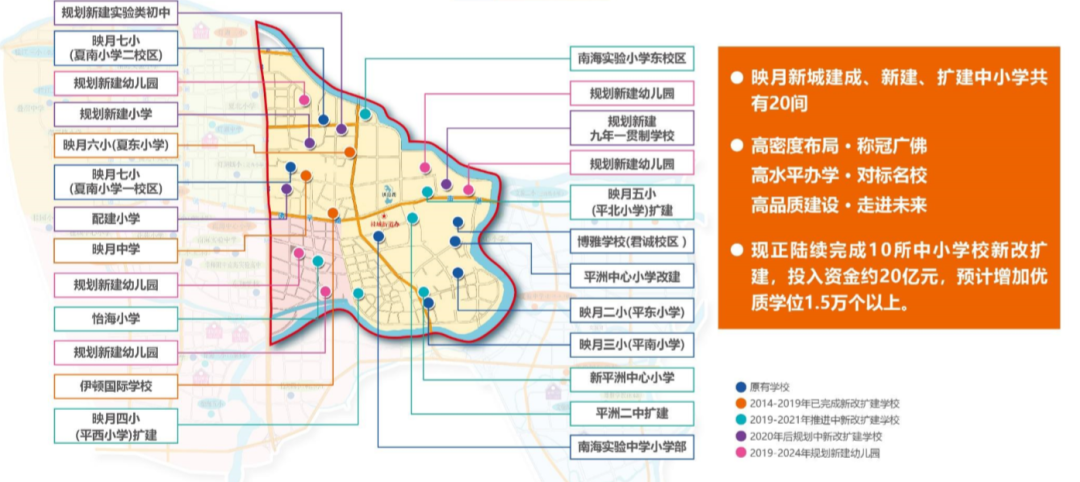 映月新城建成、新建、扩建中小学共有20间。现正陆续完成10所中小学校新改扩建,投入资金约20亿元,预计增加优质学位1.5万个以上。城市形态“三生相融”