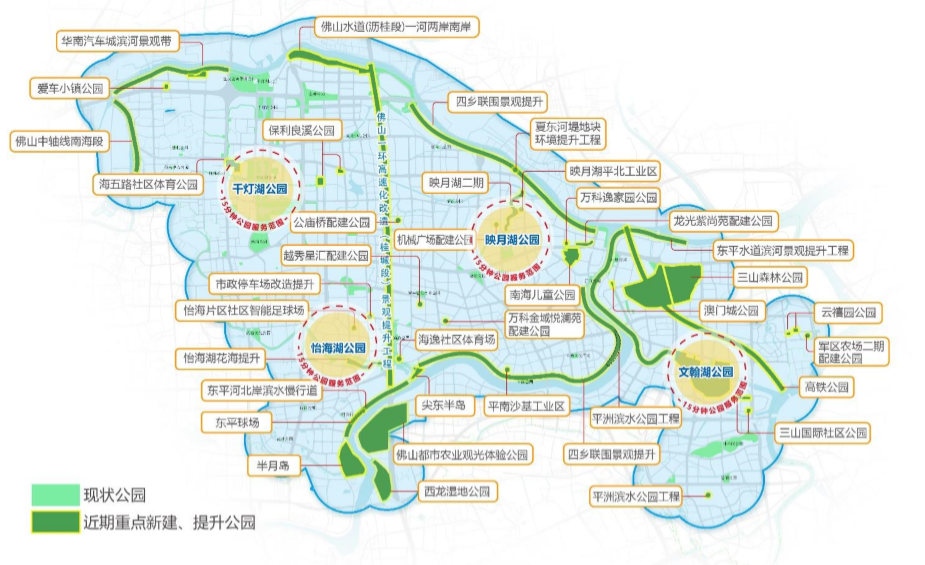 其中,平洲滨水公园位于桂城平东社区,是桂城滨河景观带三个重要节点之一,建设内容主要包括绿化景观带、园区道路、给排水、驳岸工程、供配电等基础设施活动场所、公园建筑、配套设施等,为市民提供一个在休闲娱乐、健身享受的同时还能享受滨水景观的共享空间。3 南海儿童公园