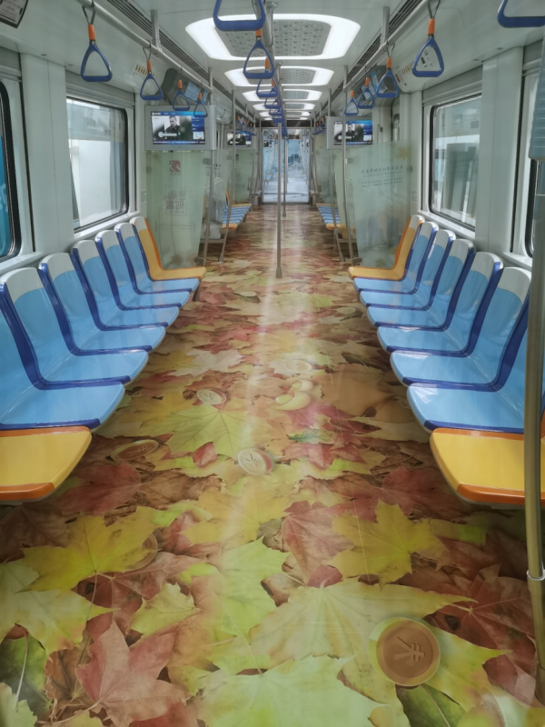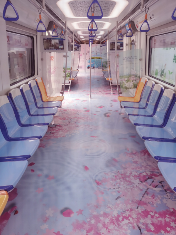 11号县车厢设计亦以代表大海的蓝色为基调,以具有崂山特色的四季为景致,以裸眼3D的沉浸式场景为特色,在全面展示崂山城区形象及发展成就的同时,为乘客打造出具有丰富观感体验的乘车环境。