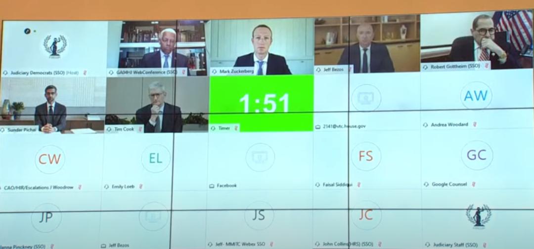 被美国媒体称为“新镀金时代”的掌门人物——亚马逊的杰夫•贝佐斯(Jeff Bezos)、苹果的蒂姆•库克(Tim Cook)、Facebook的马克•扎克伯格(Mark Zuckerberg)和谷歌的桑达尔•皮查伊(Sundar Pichai)——以线上视频形式,首次一起参与了国会听证。