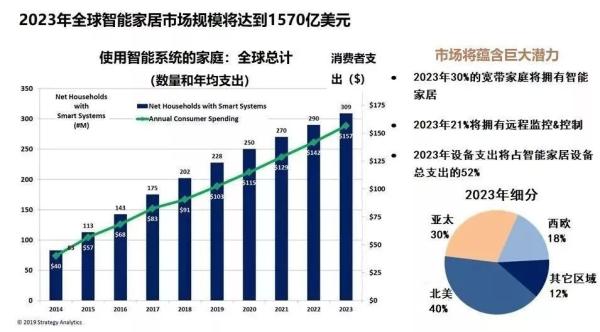 人工智能等新技术家庭场景广泛应用,带来智能化日益普及的同时,智能家居市场也呈现稳健增长态势。根据Strategy Analytics权威调研机构早前所发布的智能家居市场预测显示,2019年消费者在智能家居相关硬件、服务和安装上的费用支出达到1030亿美元,到 2023年将增长到1570亿美元(人民币1.1万亿元),年复合增长率达到11%。