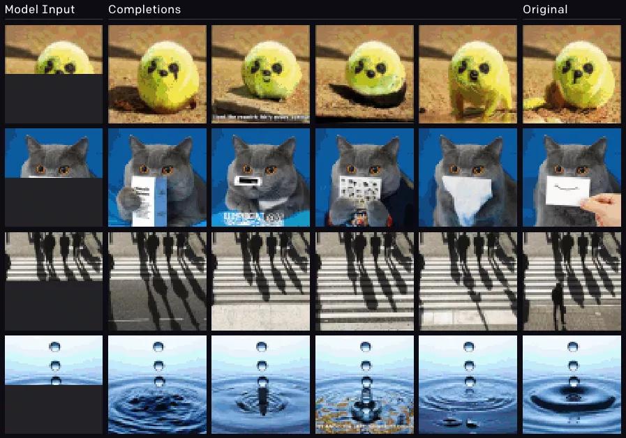 早在 GPT-2 时代,模型的自动补全图像功能就已经实现。如下图所示,最右一列是原始图片,最左侧是输入的半张图片,中间的四列是 GPT-2 自动补全的图片。
