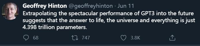 深度学习之父 Geoffrey Hinton 这样评价:「如果以 GPT-3 的出色性能推算未来,生命、宇宙和万物的答案也不过是 4.398 万亿个参数。」