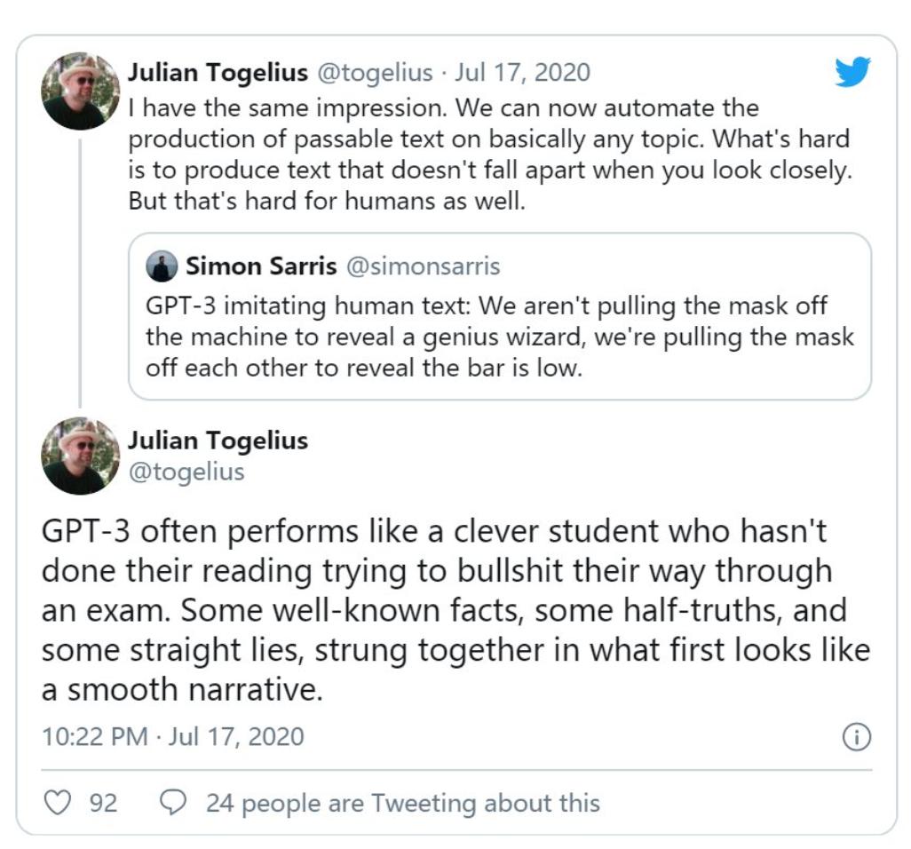 此外,纽约大学副教授、AI 和游戏研究者 Julian Togelius 这样评价 GPT-3:「它就像是一位没有认真复习的聪明学生,试图胡言乱语以期在考试中蒙混过关。它会扯到一些已知事实、似是而非的事实、谎言,并将这些串联从而看起来像是流畅的叙述。」