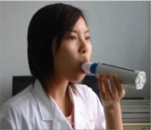 3、受试者快而用力地深吸一口气至肺总量位,随后迅速含住峰流量仪的咬口(舌头不要堵住咬口),以最大力气和最快速度爆发呼气。