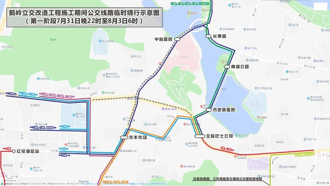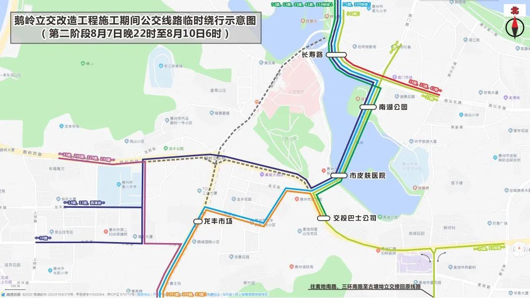 临时绕行路段:由圆通桥经长寿路、南湖路、麦地路、麦地南路、三环南路、口岸路(回程:金榜路掉头上古塘坳立交)、仲恺大道至汽车总站