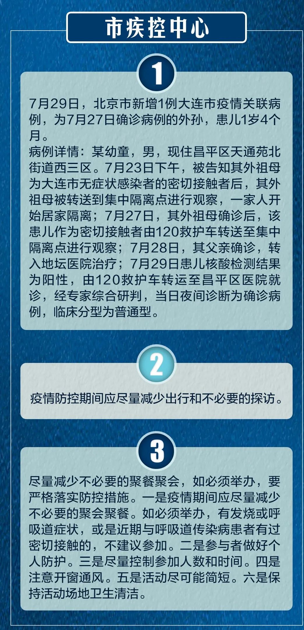 7月29日,北京新增大连市疫情关联病例1例,为7月27日确诊的大连市疫情关联病例的亲属。某幼童,男,1岁4个月,现住昌平区天通苑北街道西三区。7月23日下午,被告知其外祖母为大连市无症状感染者的密切接触者后,其外祖母被转送到集中隔离点进行观察,一家人开始居家隔离。7月27日,其外祖母确诊后。7月28日,其父亲确诊。7月29日患儿核酸检测结果为阳性,当日夜间诊断为确诊病例。