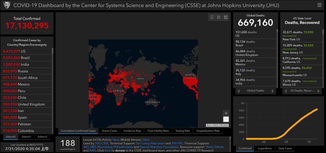 据美国约翰斯·霍普金斯大学实时统计数据,截至北京时间7月31日5时35分,全球新冠肺炎确诊病例累计17,132,653例,死亡669,256例。其中美国确诊超447.6万,巴西超255万,印度超158万,俄罗斯超83.3万,南非超47.1万,墨西哥超40.8万,秘鲁超40万,智利超35.3万,英国超30.3万,伊朗超30.1万,是全球确诊病例最多的10个国家。
