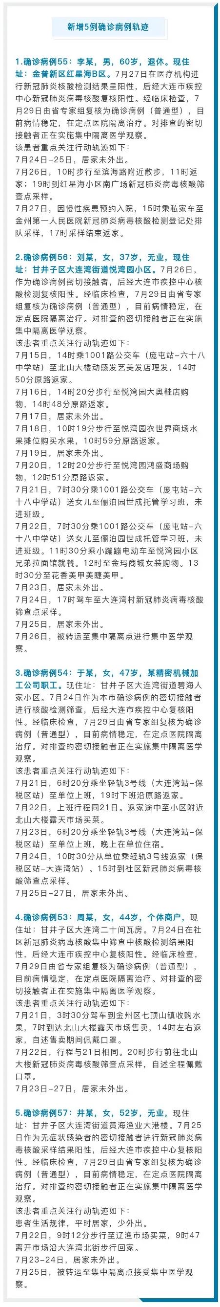 7月29日,大连市新增本地确诊病例5例(其中4例由无症状感染者转为确诊病例,1例由密接直接确诊),累计确诊病例57例,其中凯洋海鲜公司员工30例,凯洋海鲜公司员工接触者9例,大连湾街道居民9例,确诊病例和无症状感染者的密接9例。