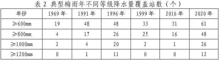 与历史典型梅雨年不同等级降水量覆盖范围相比,今年超过600毫米、800毫米、1000毫米、1200毫米的站数均为历史最多。
