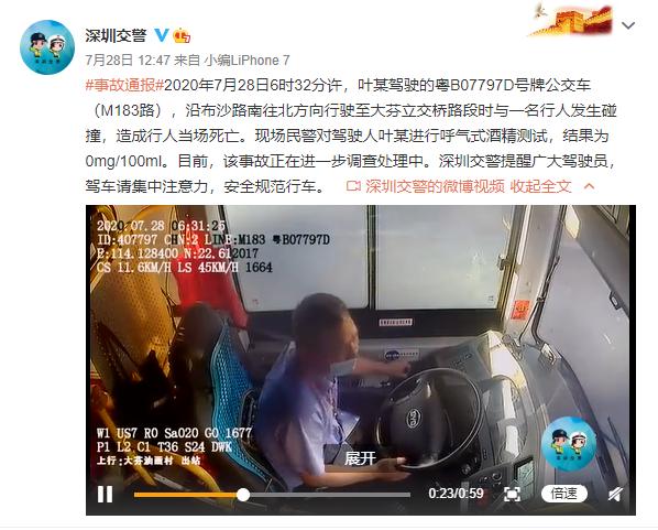 2020年7月28日6时32分许,叶某驾驶的粤B07797D号牌公交车(M183路),沿布沙路南往北方向行驶至大芬立交桥路段时与一名行人发生碰撞,造成行人当场死亡。