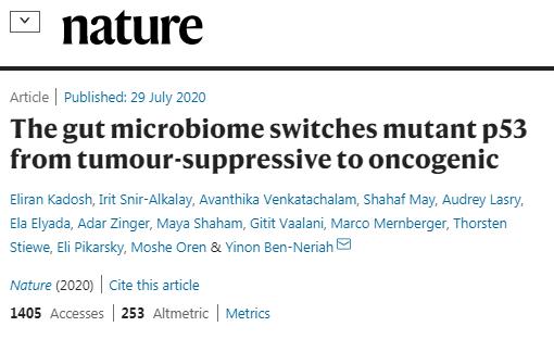 【1】Kadosh, E., Snir-Alkalay, I., Venkatachalam, A. et al. The gut microbiome switches mutant p53 from tumour-suppressive to oncogenic. Nature (2020). https://doi.org/10.1038/s41586-020-2541-0