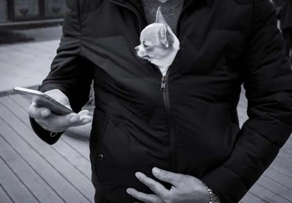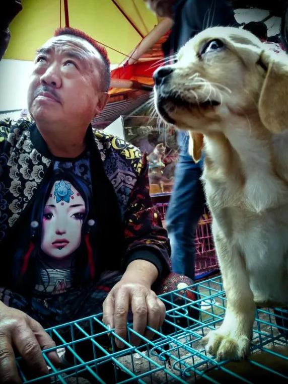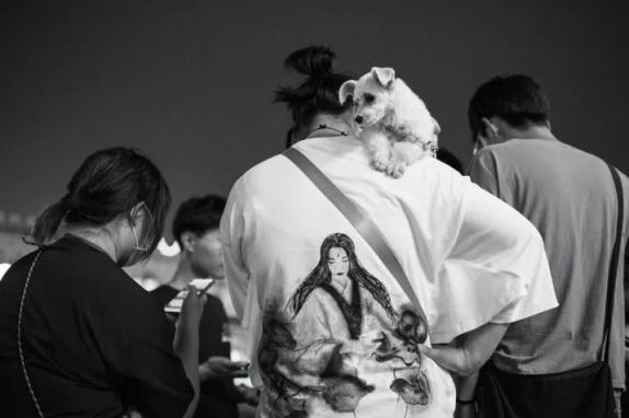 凡哥点评:小狗很可爱,但它不是重点,主人才是。这个五大三粗的汉子,头顶扎一个古人的揪揪,穿一件画着画的大袍子,肩上趴条小狗,虽然只有背影,但已经佛系尽显了。