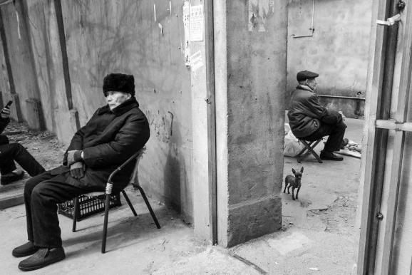 凡哥点评:扫街这事儿,脚步必须足够慢。不是怕眼睛跟不上步伐,而是怕心境不够松弛。门里门外各坐一个老头,他们也许并没有注意到对方的存在,但摄影师把他俩框在一起,就生出了一点背对背怄气的戏剧效果,那条小狗夹在中间有点不知所措。哈哈,东方大国正在跟美帝闹矛盾,很多国家都像那条小狗一样左右为难。