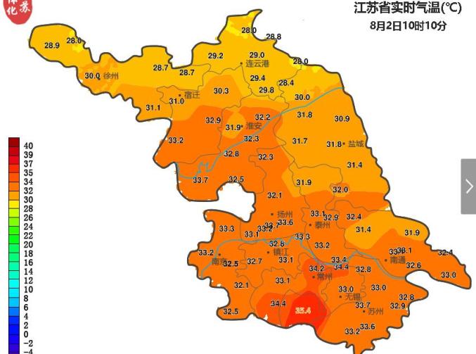 江苏省气象台2020年08月02日09时29分继续发布高温黄色预警信号:预计南京、苏州、无锡、常州、镇江、扬州、泰州、南通、淮安地区未来两天最高气温仍将达36℃左右,请注意防范。