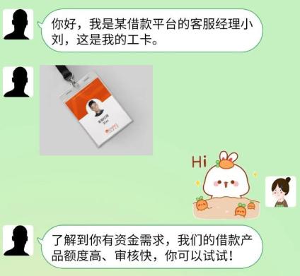 3.注意保护好个人信息和隐私,对网络上自称银行工作人员、贷款公司客服等身份推销贷款业务的人员,一定要万分警惕,正规的金融机构不会通过微信、QQ等社交软件联系借贷人沟通办理借贷业务。