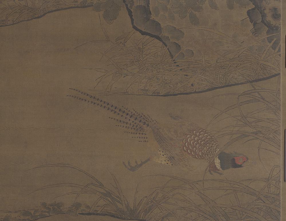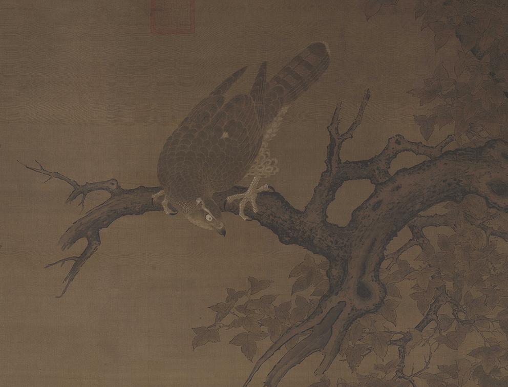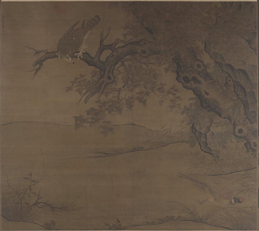 这幅《枫鹰雉鸡图》,也叫《鹰雉图》,是南宋绘画中非常少见的巨幅花鸟画,以大约两米见方的鸿篇巨制,描绘了雄鹰猎捕雉鸡的场景。