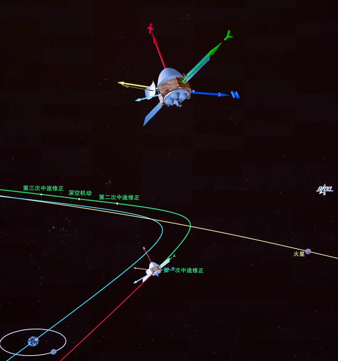 后续,天问一号探测器还将经历深空机动和数次中途修正,奔火飞行6个多月后抵达火星附近,通过制动被火星引力捕获进入环火轨道,开展着陆火星的准备和科学探测等工作。