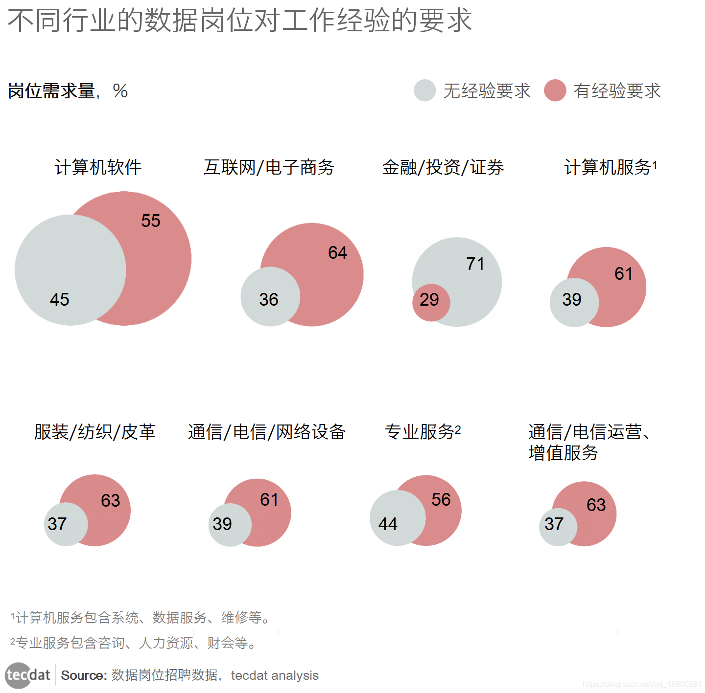 可以看到,多数岗位对工作经验有要求,其中互联网行业中对工作经验有要求的比例最高, 其次是通信/电信和服装/纺织等行业。金融投/资/证券行业的数据分析岗位的要求中无工作经验占多数, 可见招聘主要面向的是应届毕业生。