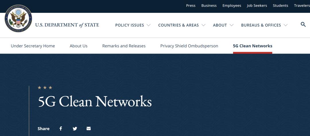 美国国务院官网宣称,“5G干净网络”由多个国家与企业共同建立,不使用任何来自“不可信IT供应商的设备”(比如华为和中兴通讯),以“确保最高的安全标准。”