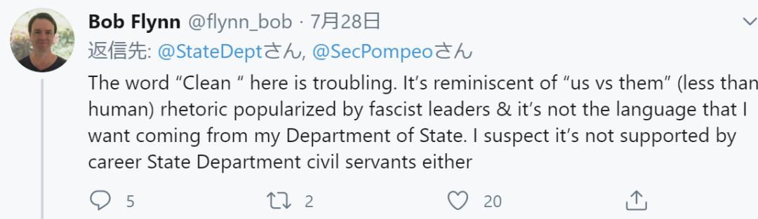而针对蓬佩奥近期多次要求有关国家在5G网络中禁止使用华为等中国企业设备,称排除了华为就等于加入了“清洁国家”的行列,中国外交部发言人汪文斌7月30日回应称,蓬佩奥对中国企业的指控没有任何事实根据。他指责华为威胁美国的国家安全,但事实证明,过去30年里,华为在全球170多个国家和地区建设了1500多个网络,为228家全球500强企业提供了服务,服务全球超过30多亿人口,没有发生过一起类似“斯诺登事件”、“维基解密”的网络安全事件,没有发生过一起类似“棱镜门”、“方程式组织”、“梯队系统”的网络监听监视行为,没有任何国家拿出华为产品存在“后门”的证据。