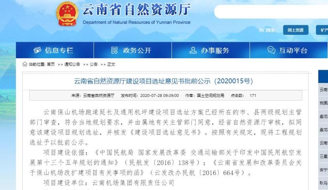 7月28日,云南省自然资源厅发布《云南省自然资源厅建设项目选址意见书批前公示(2020015号)》,拟同意云南保山机场跑道延长及通用机坪建设项目规划选址,并核发《建设项目选址意见书》。