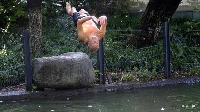 等到身体活动差不多以后,他就会在岸边的一块大青石上开始自己的表演——整个户外游泳基地独一无二的“背身跳水”。