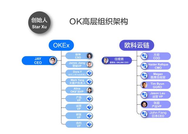 徐明星是毋庸置疑的OK创始人,但与OKEx18年后做切割,官方不再提及。不过仍然是欧科云链大股东,更多以欧科集团创始人名义出席活动。OK目前的业务架构划分成两部分,第一是交易所业务OKEx;另一类是香港上市公司欧科云链,包括OKLINK、合规交易平台OKCoin等。