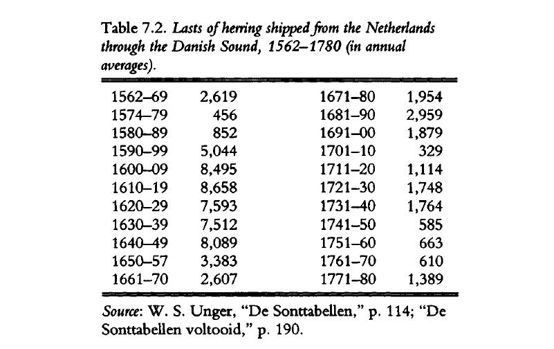 鲱鱼业的利润确实是荷兰共和国经济繁荣最早的条件之一,而且也是最重要的,因为它会带动很多产业的发展,运输、造船、贸易,全从这里带起来。我这里找了一个表格,就是1562—1670年,这100多年里面,荷兰每年平均通过丹麦松德海峡的船只数量。为什么知道这个数量呢?因为要交关税,从那个关税账目里查的,这个数字还是挺大的。看得出来,它是荷兰经济繁荣一个很重要的基础和条件。
