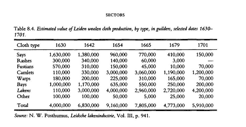 这里我找了一个表格,1630—1701年,这70年里,莱顿地区纺织业的产量按照产品的种类划分,这个产量是很大的。后面的货币单位是荷兰盾,当然也有人把它音译成「古尔登」,译意就是荷兰盾。